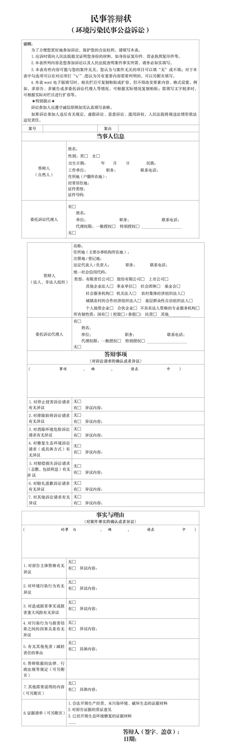环境污染民事公益诉讼民事答辩状(示范文本)